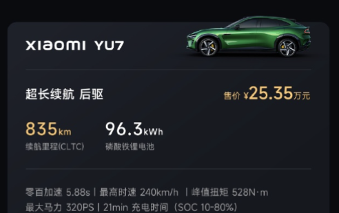 同日晚间,小米创始人、董事长兼CEO雷军在小米人车家生态发布会上宣布,小米汽车首款SUV车型YU7标准版的售价为25.35万元,比Model Y便宜1万元。