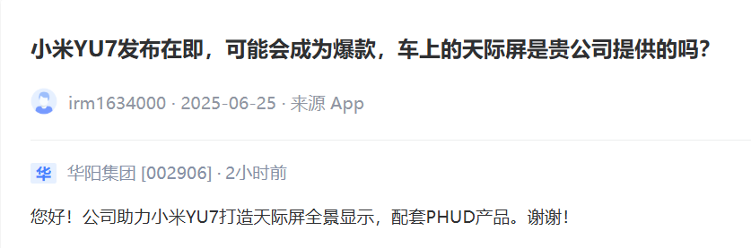 华阳集团表示,公司助力YU7打造天际屏全景显示,配套PHUD(全景抬头显示器)产品。