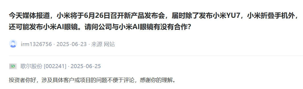 部分上市公司以保密条款为由,回避了投资者询问其产品是否应用于SU7和YU7的问题。
