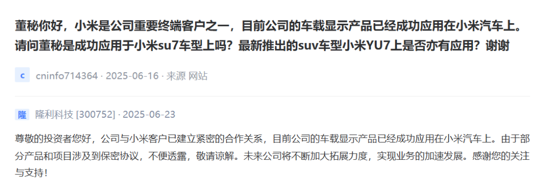 隆利科技表示,目前,公司的车载显示产品已经应用在小米汽车上,但部分产品和项目涉及保密协议,不便透露。