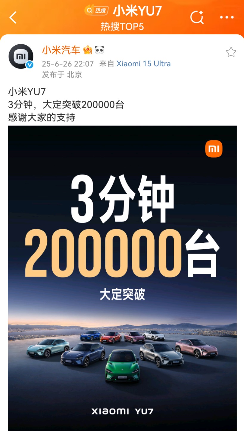6月26日晚间,小米汽车官微发布消息称,YU7正式发布后3分钟,大定突破20万辆。