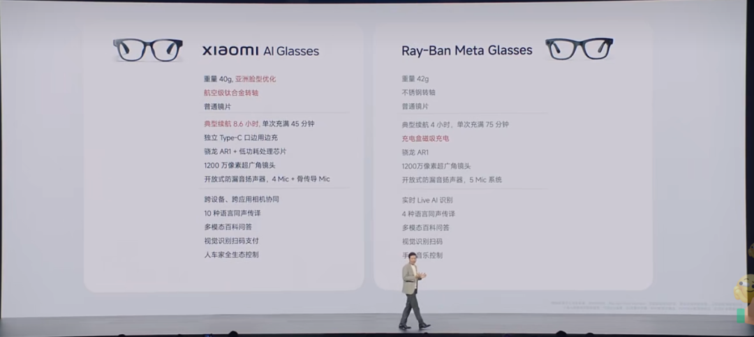 雷军在发布小米AI眼镜时,对比产品是Ray-ban Meta Glasses。