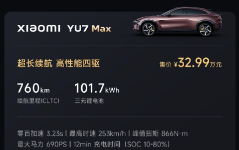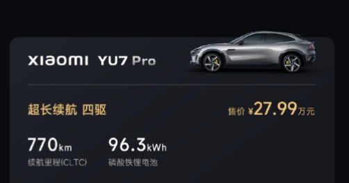 具体来看,YU7标准版售价25.35万元、Pro版售价27.99万元、Max版售价32.99万元。