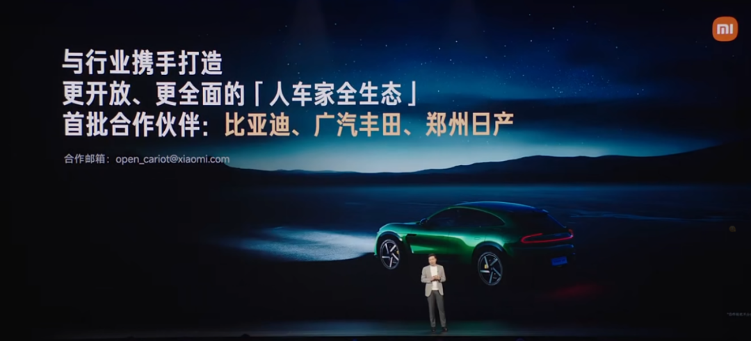 同时,小米汽车决定打造更加开放、全面的人车家全生态,首批合作伙伴包含比亚迪、广汽丰田、郑州日产。